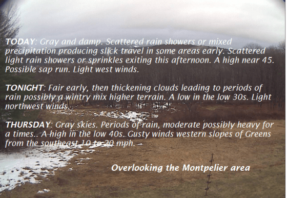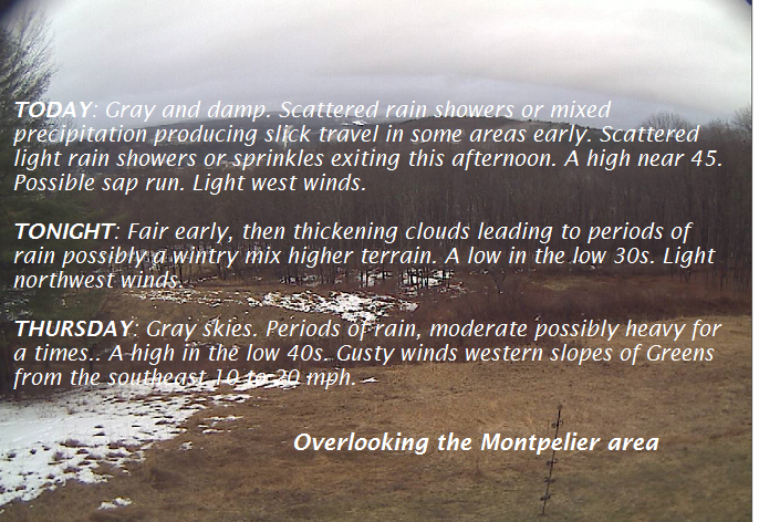 TODAY: Gray and damp. Scattered rain showers or mixed precipitation producing slick travel in some areas early. Scattered light rain showers or sprinkles exiting this afternoon. A high near 45. Possible sap run. Light west winds.