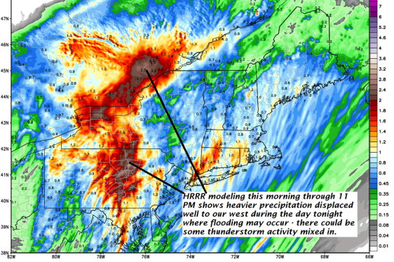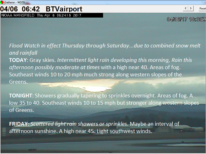 TODAY: Gray skies. Intermittent light rain developing this morning, Rain this afternoon possibly moderate at times with a high near 40. Areas of fog. Southeast winds 10 to 20 mph much strong along western slopes of the Greens.