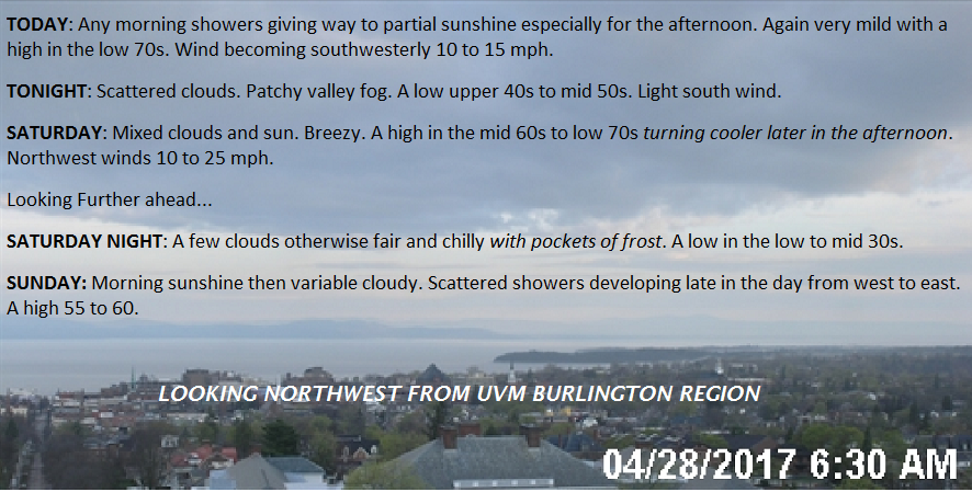 TODAY: Any morning showers giving way to partial sunshine especially for the afternoon. Again very mild with a high in the low 70s. Wind becoming southwesterly 10 to 15 mph.