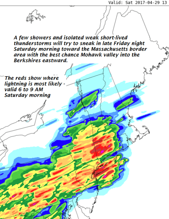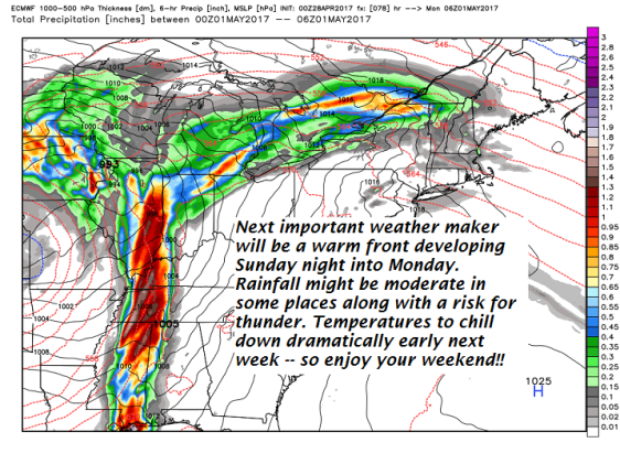 SUNDAY: Morning sunshine then variable cloudy. Scattered showers developing late in the day from west to east. A high 55 to 60.