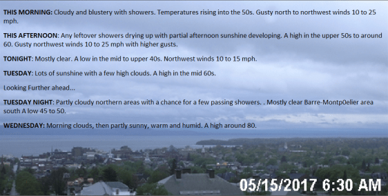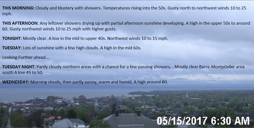 TUESDAY NIGHT: Partly cloudy northern areas with a chance for a few passing showers. Mostly clear Barre-Montp0elier area south A low 45 to 50.
