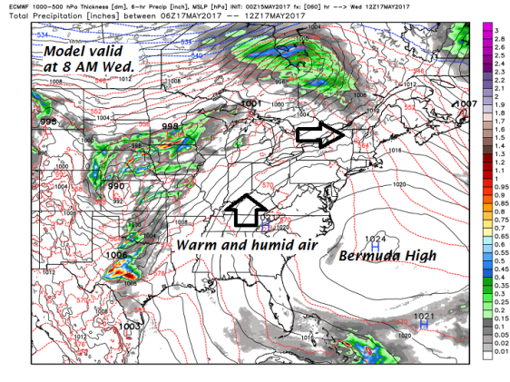 WEDNESDAY: Morning clouds, then partly sunny, warm and humid. A high around 80.