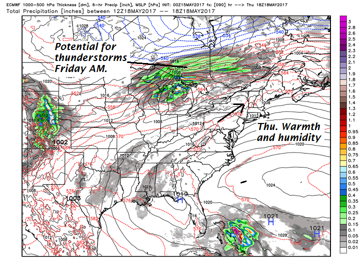 FRIDAY: Warm and humid start with scattered showers and possible thunderstorms early, then increasingly sunny and blustery. Temperatures in the low 60s early, falling through the 50s in the afternoon. Gusty northwest winds.