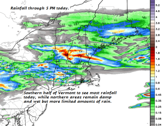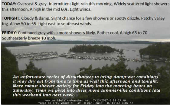 TODAY: Overcast & gray. Intermittent light rain this morning, Widely scattered light showers this afternoon.A high in the mid 60s. Light winds.
