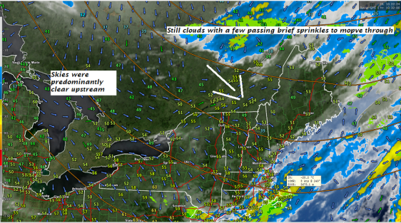 TODAY: Fog burns off to partly to mostly sunny skies and milder. An Isolated hit or miss brief shower or sprinkle. A high in the low 70s. Northwest breeze 10 to 25 mph this afternoon.