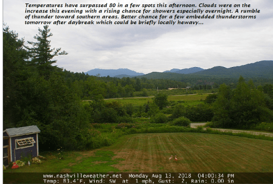 TUESDAY NIGHT: Mainly cloudy. Chance for a shower or thunderstorm northern areas late. A low in the low 60s. Light west winds.