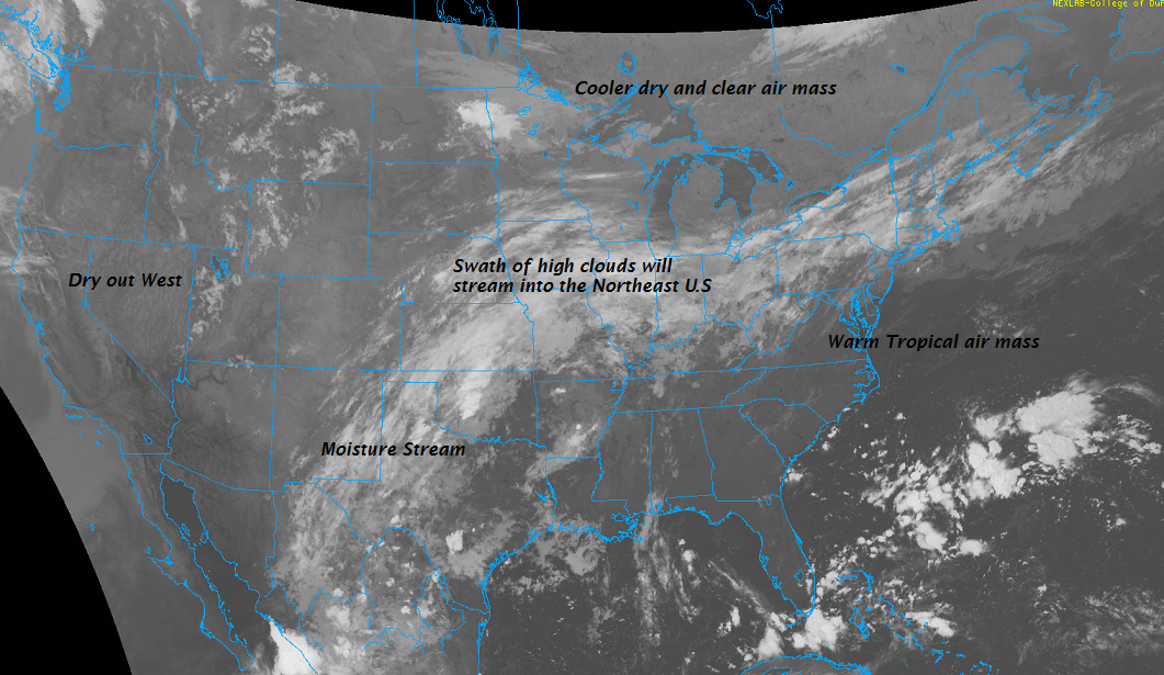 TODAY: Morning fog burns off, then sunshine filtered by high cloudiness. Pleasant. A high in the mid 70s. Light west winds.