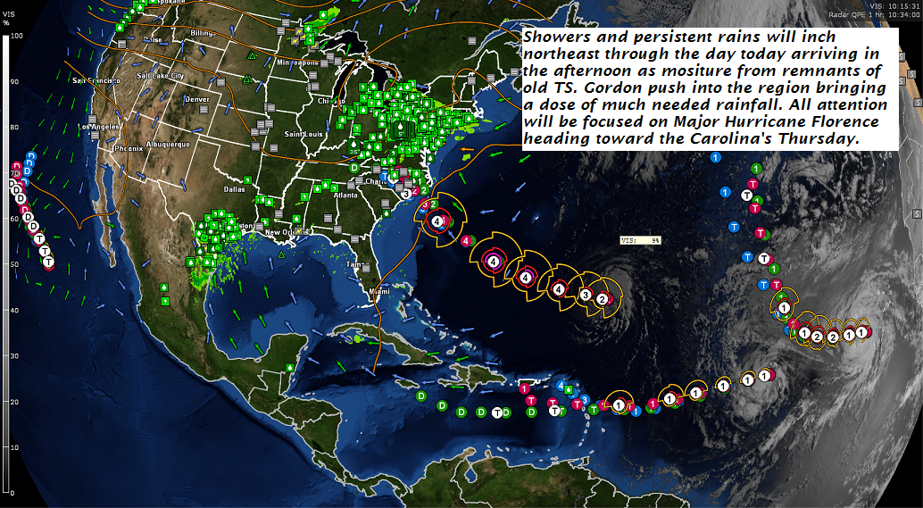 TODAY: Thickening clouds leading to periods of showers developing south to north this afternoon. Continued rather chilly. A high around 60. Southeasterly breeze picking at 10 to 20 mph