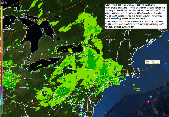 WEDNESDAY: Widely scattered showers, otherwise clouds mixed with periods of sunshine. Showers and thunderstorms developing later in the afternoon…some strong to locally severe. Milder and rather muggy with a high around 75. Southwesterly breeze 10 to 20 mph.