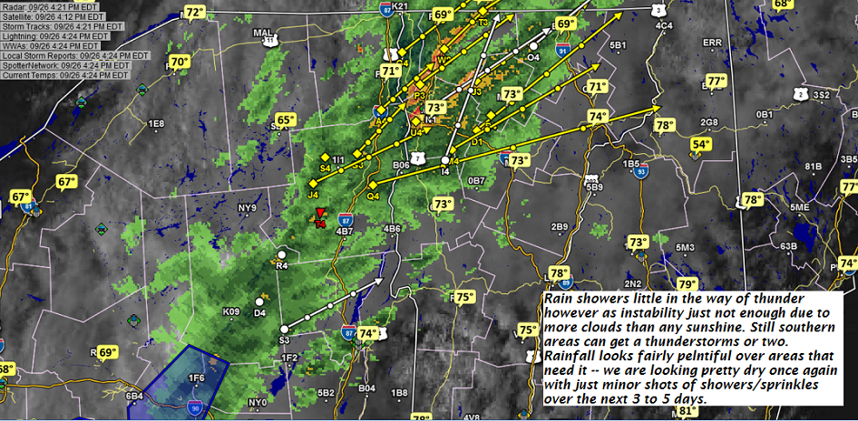 TONIGHT: Evening showers and isolated thunderstorms, some locally heavy exiting by late evening. Otherwise partial clearing and moonlit with patchy valley fog. A low near 50. Light northwest winds.