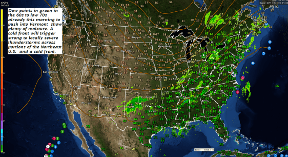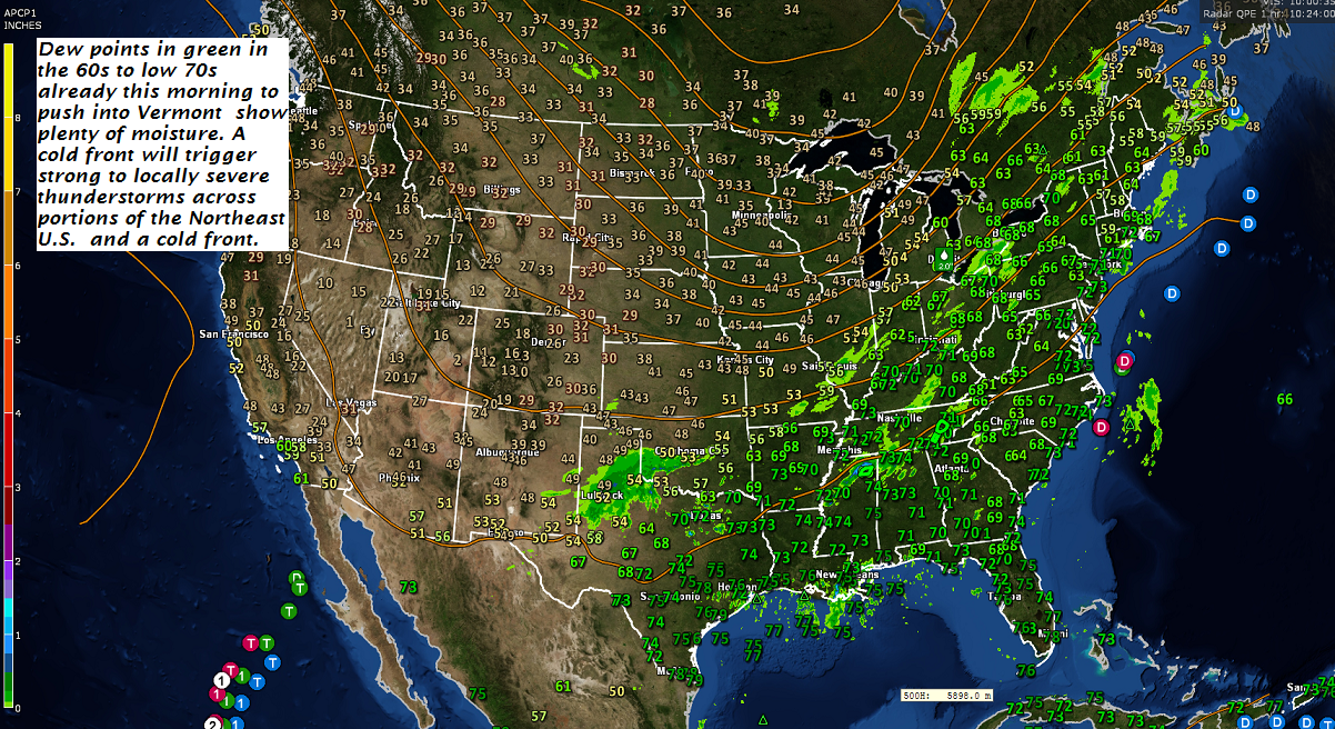 TODAY: Cloudy. Widely scattered showers..maybe rumble of thunder Champlain Valley this morning, otherwise clouds mixing with intervals of sunshine. Showers and thunderstorms this afternoon…some strong to locally severe with gusty winds, hail and heavy downpours. Mild and muggy. A high near 75. Southwesterly breeze 10 to 20 mph.