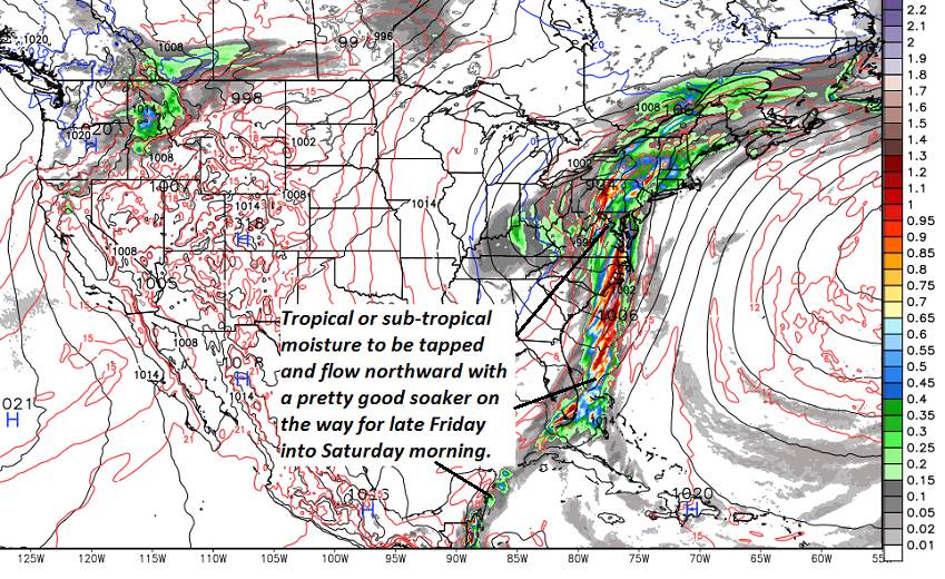 SATURDAY: Gray, damp but mild. Chance for rain, possibly moderate at times in the morning tapering to scattered showers in the afternoon. Some potential for high water on area rivers and streams. A low 50 to 55. A high low to mid 60s.