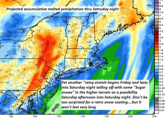 SATURDAY: Gray. Rain showers likely…mixing with wet snow higher terrain especially in the afternoon with minor accumulation grassy surfaces. A high in the upper 30s to mid 40s.