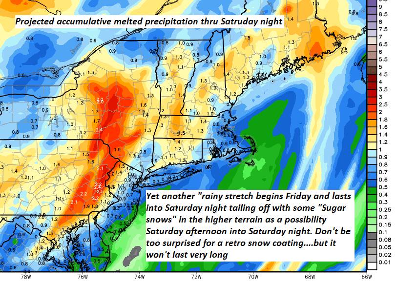 SATURDAY: Gray. Rain showers likely…mixing with wet snow higher terrain especially in the afternoon with minor accumulation grassy surfaces. A high in the upper 30s to mid 40s.