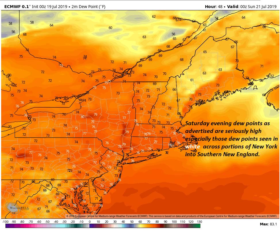 TODAY: Mixed sun and clouds. Isolated afternoon thunderstorms near the Quebec border, possibly strong. Warm and sticky. A high 85 to 90. Feels like temperatures in the mid 90s. Southwest breeze 10 to 15 mph.