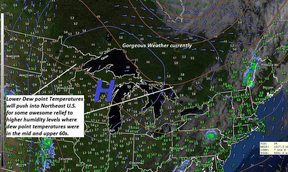 SATURDAY: Partly to mostly sunny. A few more clouds far northern areas late with chance for an evening shower or thunderstorm. A low in the mid 50s. Moderate humidity returns late with a high 80 to 85.