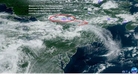 TOMORROW: Mixed clouds and intervals of sunshine. Widely scattered showers exiting northern areas by midafternoon. Muggy. A high in the mid-70s. Light northwest winds.