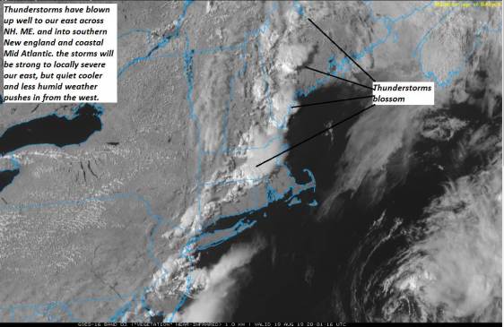 THURSDAY: Clouds…mixing intervals of afternoon sunshine. Scattered afternoon showers and thunderstorms.. Less humid later in the day. A high 75 to 80.
