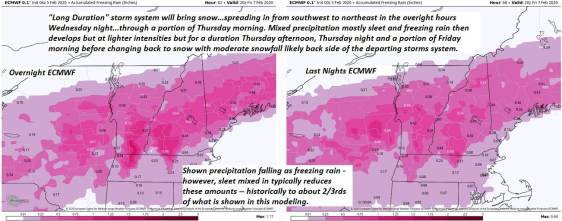 THURSDAY: Cloudy. Periods of accumulating snow moderate at times…changing to a wintry mix of sleet and freezing rain late central and southern areas. About 2 to locally 5”accumulation Snow coated roads and some glazing with slick travel. A late day high in the upper 20s. Light east winds.