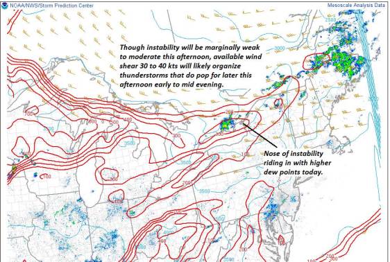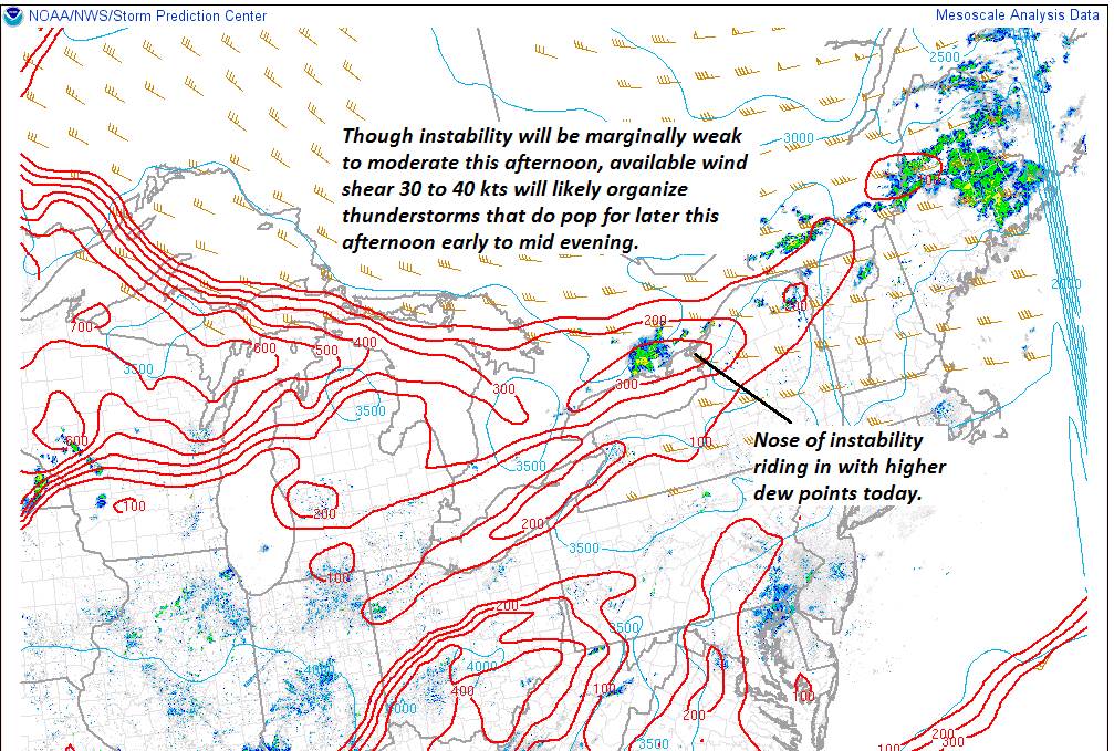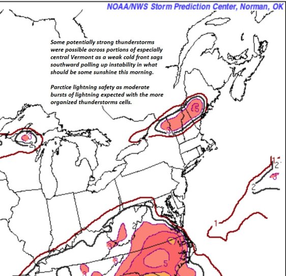 TODAY: Clouds with a few showers this morning northern areas. Scattered showers with a few thunderstorms especially central Vermont. One or two storms may become briefly strong with gusty winds and heavy downpours. Moderately humid with a high 75 to near 80. Southwest breeze 10 mph.