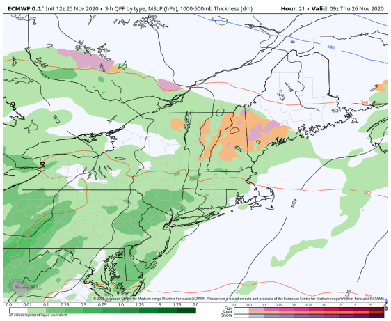 TOMORROW THANKSGIVING DAY: Gray skies with areas of fog. Scattered light rain showers. Maybe some late day sunny breaks northern areas. Milder with a high pushing toward 45 later in the afternoon. Southeast winds 10 mph.