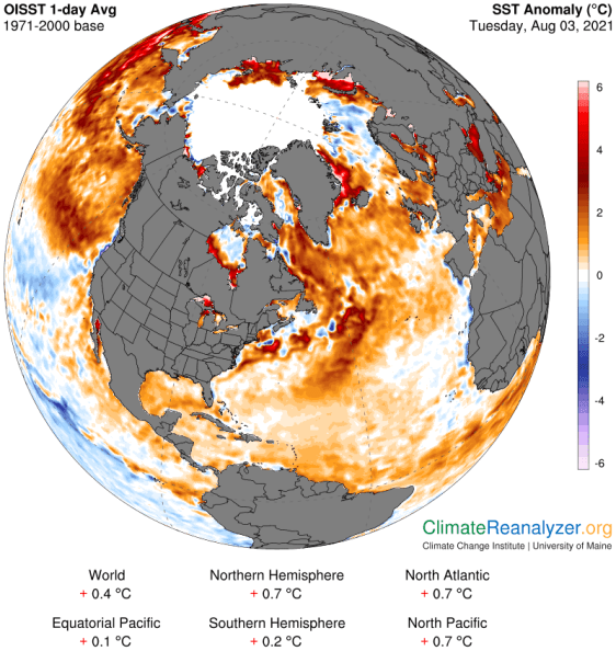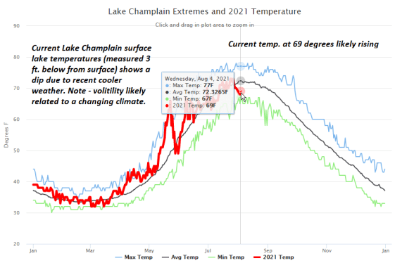 Warmest surface water temperatures early August based off local lake climatology.