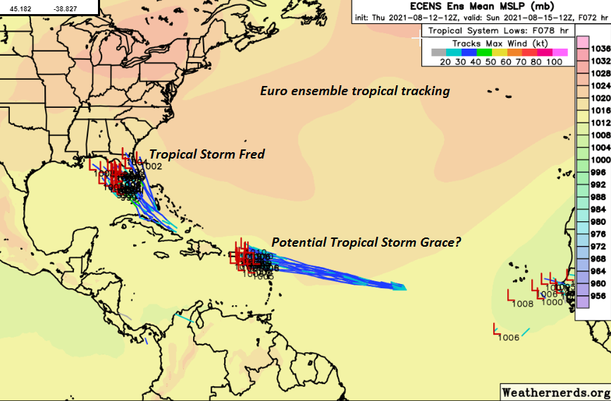 TONIGHT: Scattered showers and isolated thunderstorms winding down this evening, some strong with locally heavy downpours early. Otherwise variable cloudiness and continued muggy. Patchy valley fog. A low mid-60s to around 70. Light southwest breeze.