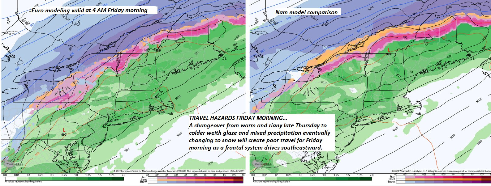 THURSDAY NIGHT: Overcast. Rain likely…moderate at times. Potential for rising rivers combined with snow melt, ice break up & ice jams. Rain …transitions to freezing rain and sleety snow…during the morning commute, producing hazardous travel. A low upper teens to mid-20s.