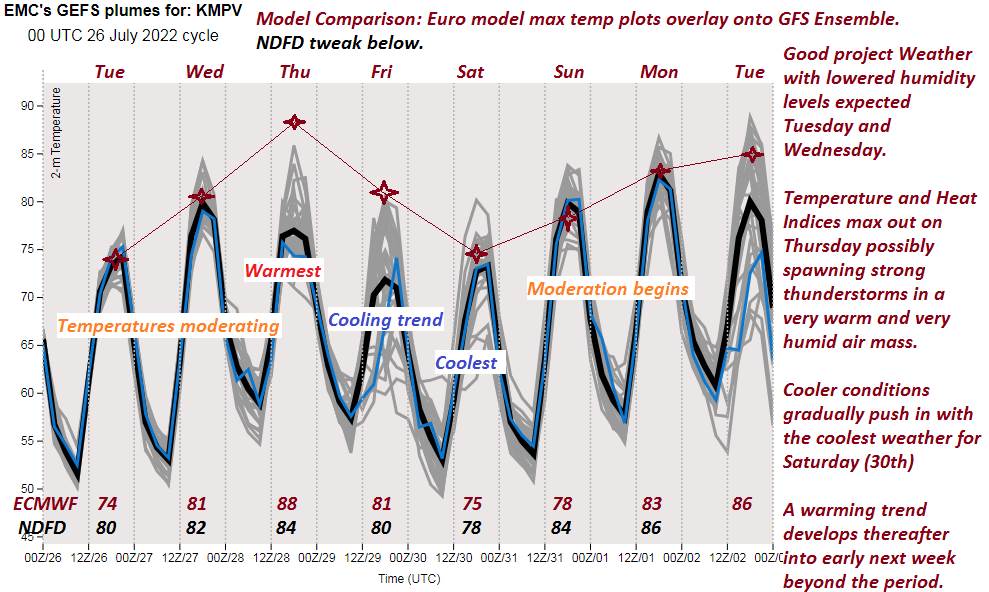 WEDNESDAY NIGHT: Fair in the evening then thickening clouds. A low in the mid to 50s to low 60s warmest Champlain Valley. Light southeast winds.