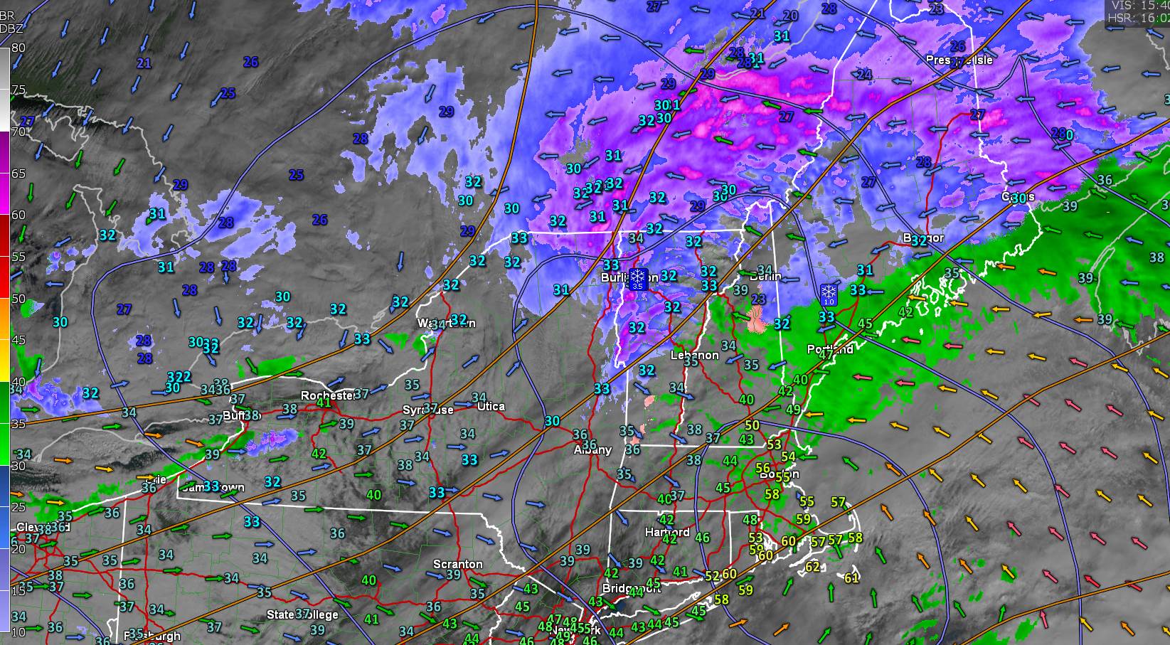 THIS AFTERNOON: Gray. Wet…mostly light accumulating snow northwest of the Barre-Montpelier area tapering to flurries. A wintry mix southeastern two-thirds of the state changing back to flurries before exiting. A high about 35. Light variable winds.