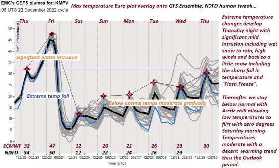TONIGHT: Overcast. Periods of mixed wet snow, sleet and freezing rain with slick travel, except mainly rain western areas. Up to an inch sleet/wet snow east of the Greens. An evening low upper 20s around 30 warming into the 40s western Vermont. East to southeasterly winds developing 10 to 30 mph with gusts exceeding 50 mph near western slopes Green Mountains.