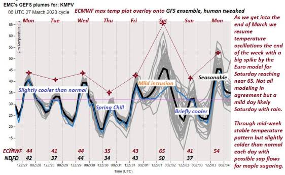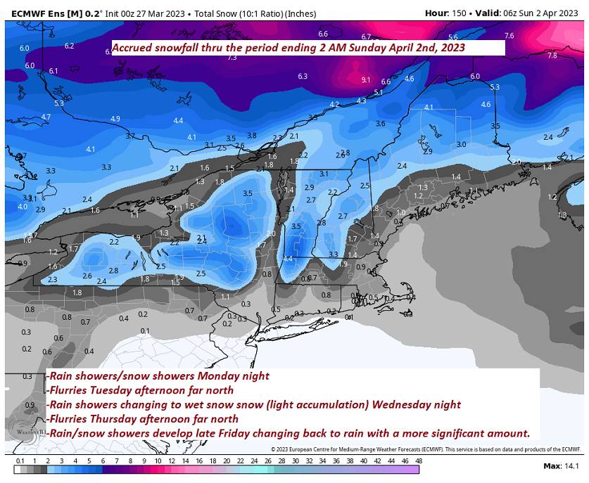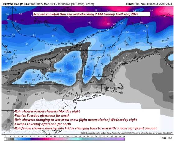 TONIGHT: Wet snow showers developing as rain showers valleys roughly Barre-Montpelier area south with a dusting to a sloppy inch or two before exiting to clearing late this evening and overnight. A low in the upper 20s. Light north winds.