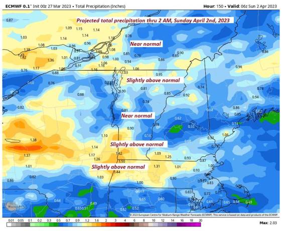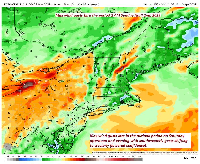 SATURDAY: Gray. Chance for period of rain moderate at times with a rumble of thunder possible. Breezy to windy. A low 35 to 40. A high in the 50s.