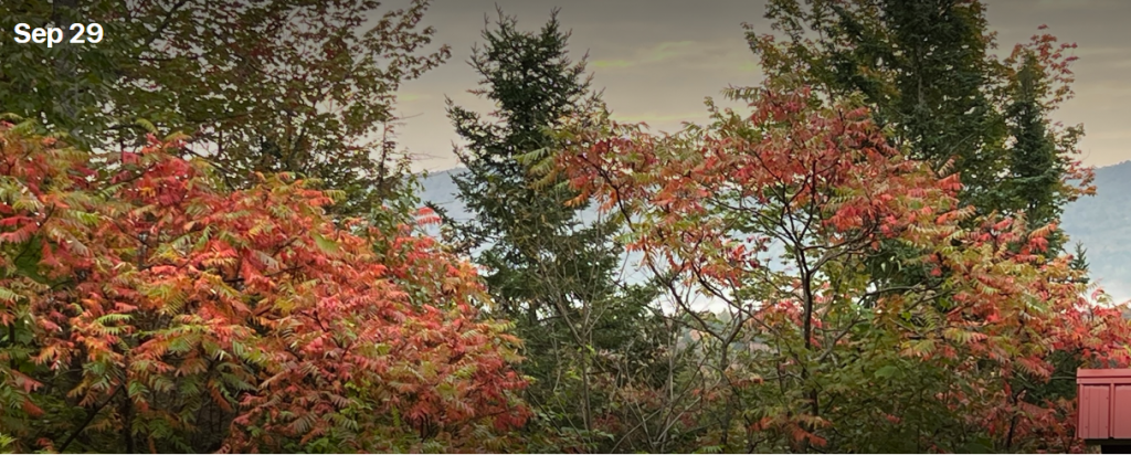 Red Sumac lighting up as colors which started slow, play catch-up. Posted on September 29, 2023 by Weathering Heights The transition to brilliant Fall-foliage was underway. Red Sumac living up to expectations in Worcester, Vermont. Fully expect a vibrant fall-color season in the Green Mountain State in the next two weeks. Share this: Share on X (Opens in new window) X Share on Facebook (Opens in new window) Facebook Like Loading... Related