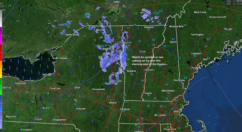 TODAY: Possible sprinkle…and isolated icy spots before 9 AM. Considerable valley fog gives way to clouds and intervals of sunshine. Turning milder. A high in the mid to upper 50s. A light south wind.