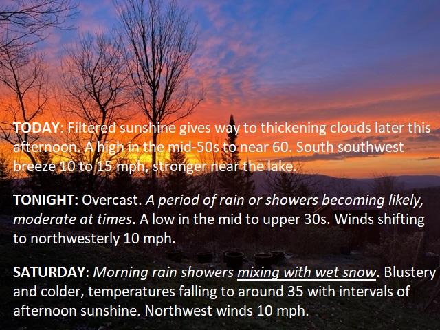 Extra special sunrise this morning but otherwise some hints of sun with increasing high cloudiness. A cold front approaches bringing showery/rainy weather tonight – colder tomorrow into early next week.