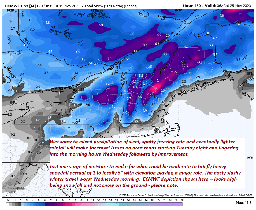 TUESDAY NIGHT: Overcast & blustery at time. Periods of accumulating wet snow developing…moderate at times with an inch or two western areas…to locally 4 inches southern and eastern areas…before mixing with sleet and pockets of freezing rain. Watch for poor travel conditions. A low ranging from the upper 20s to near 32 degrees western areas.