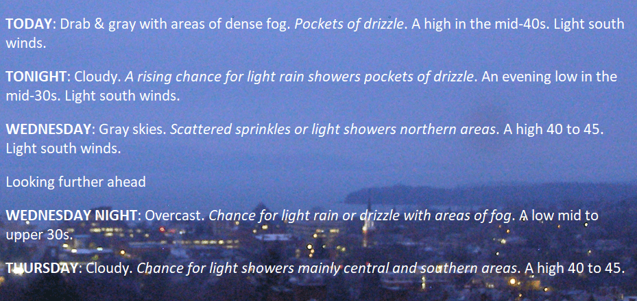 With the bigger storm systems over the central and western U.S., storms shift east and basically go to die over the Northeast. The net result is very stable dark, drab, and dreary weather with misty sprinkles, and dense fog for many days to come.