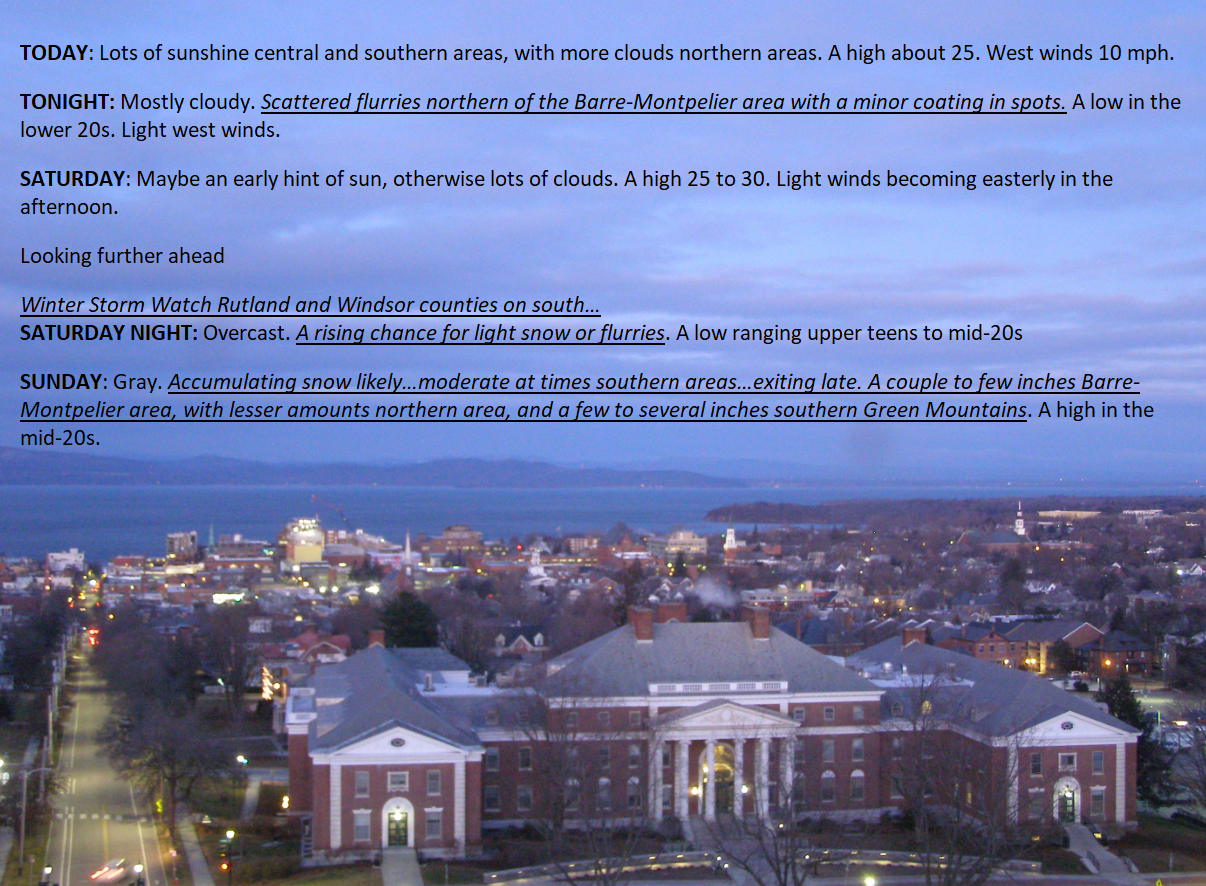 No problem areas for today, but tonight could see minor coatings of snow across the northern tier region. Not a bad Saturday, before light accumulating snow arrives Saturday evening and Sunday. Best jack-pot snows remain to our south.