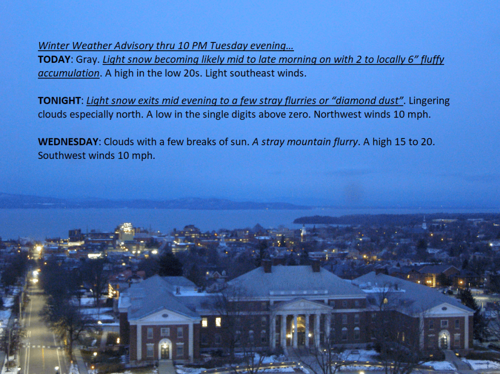 Snowfall amounts a little higher as a weak Nor’easter coastal low tracks closer and spreads slightly more moisture in. About 2 to locally 6″ of fluffy powder in order. Departs this evening, but lots of colder weather plus lake effect flurries.