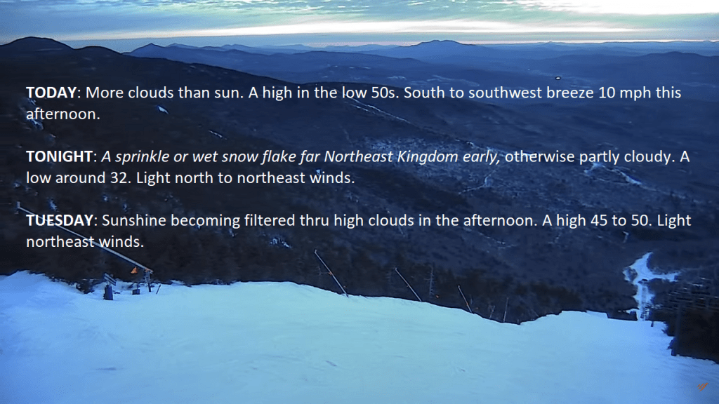 Mid and high clouds to allow for some sunny periods mixing in today, and just high thinner clouds Tuesday making for a couple real nice days in the Green Mountain State. Major storm system affects the region later in the week, with wet snow mixed with rain valleys, and high winds interacting with terrain central and southern Vermont.