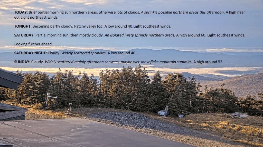 Looking east from Mount Mansfield slopes toward the Worcester’s. Patchy valley fog, with multiple cloud layers but enough drier air to make for some brief sunshine. Clouds will rule though, and some possible sprinkles. Little change going into Tuesday…