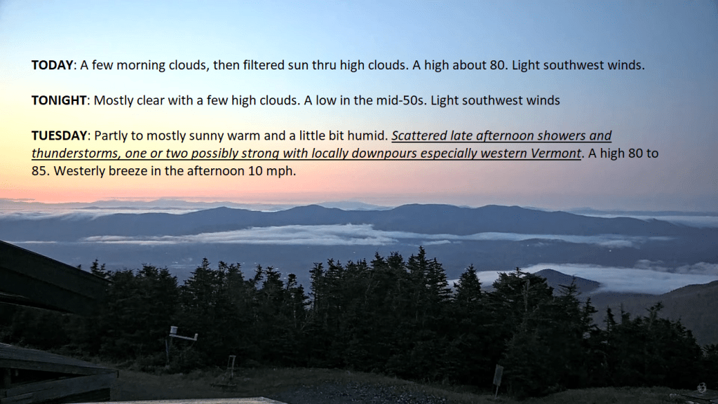 …And right to summer this week. Change of flows has occurred instead of off the Gulf of Maine and generally gray, we’ll see more humidity and warmth but gradually. Tomorrow late afternoon showers and thunderstorms arrive with a nearly daily occurrence for a few days this week.