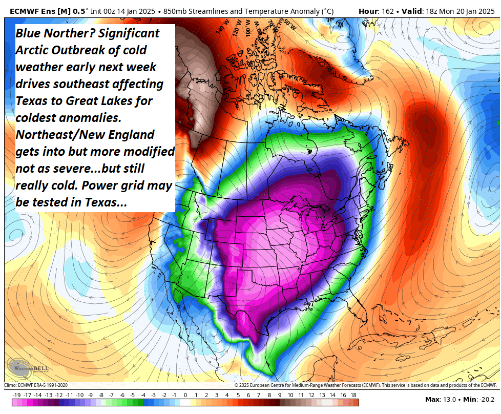 High latitude blocking forces arctic air southeast especially through the Rockies and Plains ending up in mid-section of the nation early next week. Shown – modelled for Monday Afternoon. Posted on January 14, 2025 by weatheringheights1 Share this: Click to share on X (Opens in new window) X Click to share on Facebook (Opens in new window) Facebook Like Loading... Related