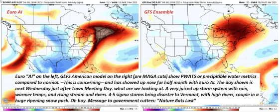 Problems Ahead: Please be aware…. if we get warmth and rain, this could be very problematic for flooding. Everybody should start thinking "spring and milder temperatures" in a week or two. There is one "super loaded 4-5 sigma" standard deviation of juiced up precipitable water signal in the longer range modeling that if comes to fruition could really raise river levels. Do not panic or freak out over this, as it may not be so bad. Let’s just slowly get a handle with the idea of snow removal and prepare for ice jams, heavy snowmelt…combined with (…hate to say this) but Rain.
