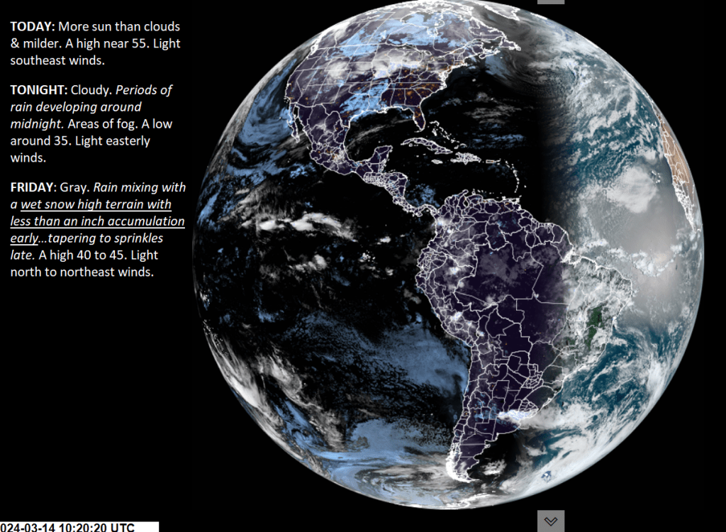 TOMORROW: Gray Periods of morning rain…mixed with slushy snow accumulation elevated terrain with less than an inch…exiting early afternoon to intervals of late day sun. A high in the low 40s. North to northeast winds 10 mph.