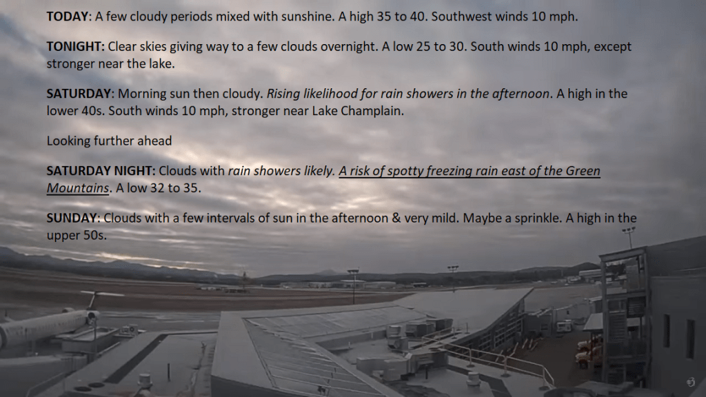 TODAY: Cloudy. Light rain showers arriving by early afternoon. A high mid-40s to mid-50s warmest Champlain valley. Southeast breeze 10 mph.