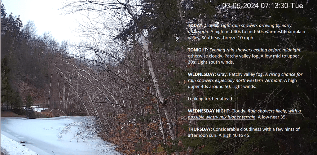 WEDNESDAY: Gray. Patchy valley fog. A rising chance for rain showers especially northwestern Vermont. A high upper 40s around 50. Light winds.