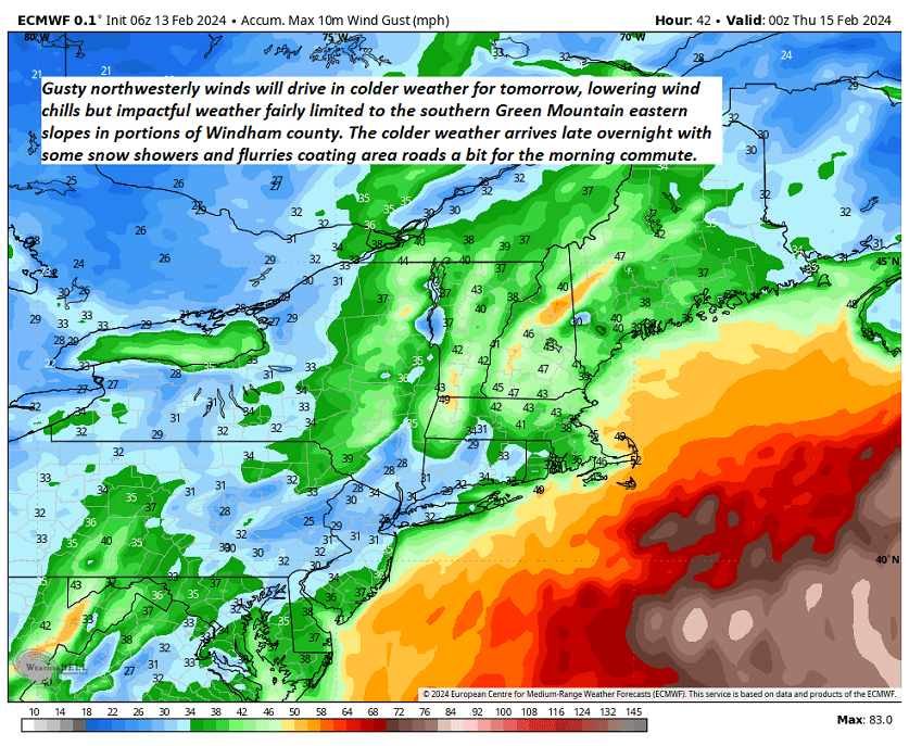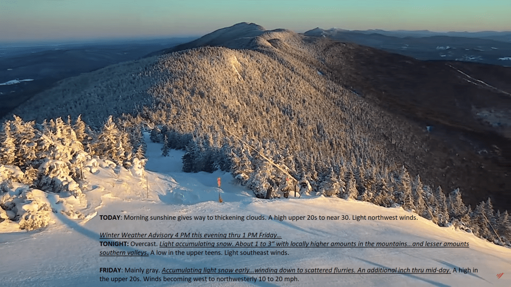 Lots of weather changes come through over the next 24 hours. A super mild air mass producing a few thunderstorms to our west will shift in later this morning. Snowmelt owed to the warm temperatures making stream and river rises in flood-prone areas. Gusty northwest winds drive in a big temperature drop with a shot of snow.