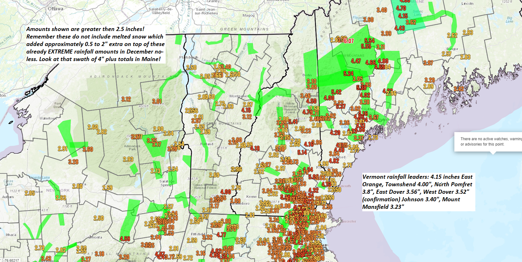 48 hour rainfall thru 9 AM this Tuesday morning. Remember these amounts do not include snow melt which added an extra 0.5″ to 2″ meltwater. Posted on December 19, 2023 by Weathering Heights